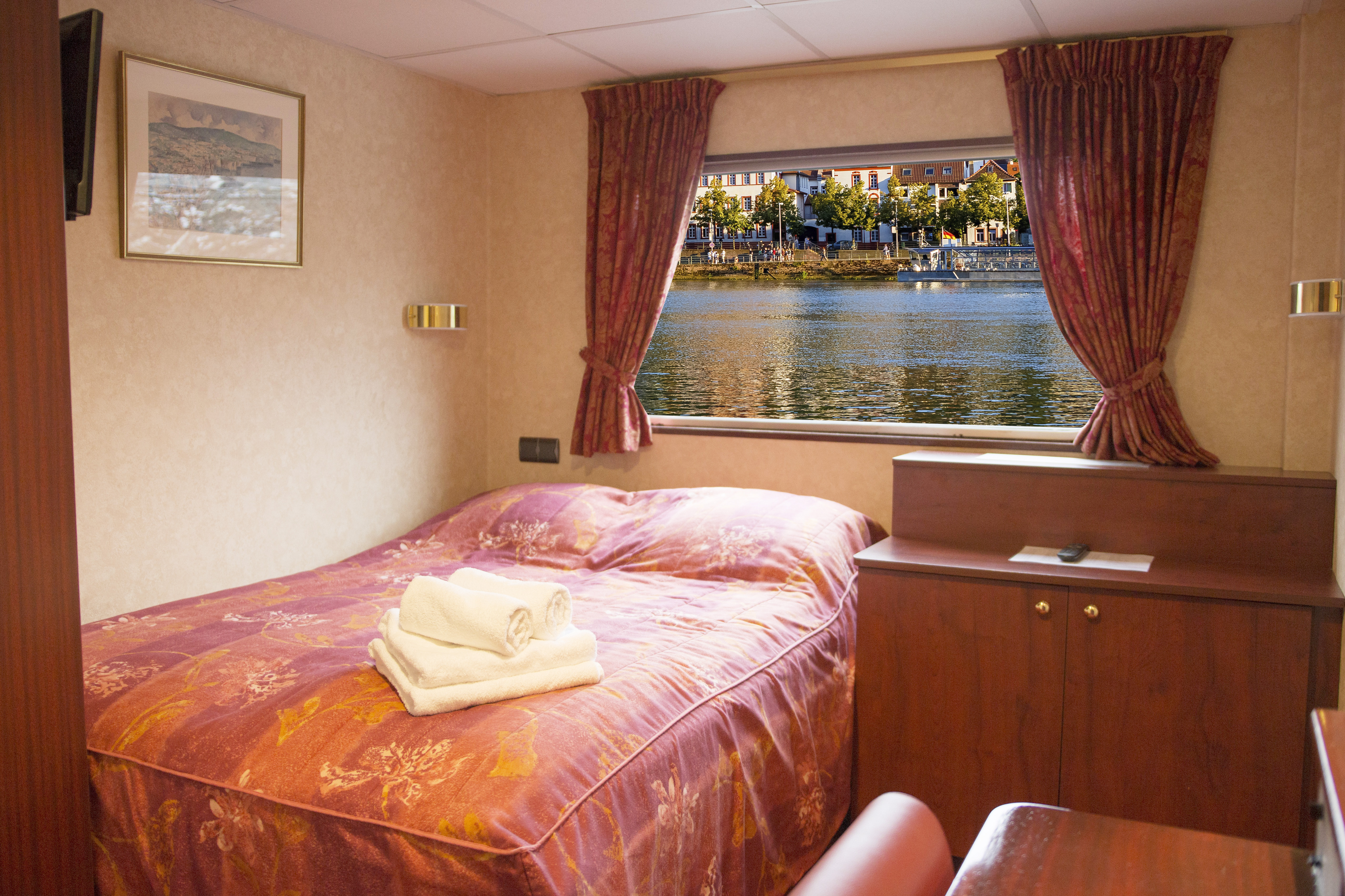 Comfortable cabin equipped with two beds that can't be joined together, private bathroom with shower and bath products, telephone, satellite TV, safe, hairdryer, air-conditioning, radio and wardrobe with hangers. Located at the upper deck with picture window with sliding top section it offers a panoramic view.